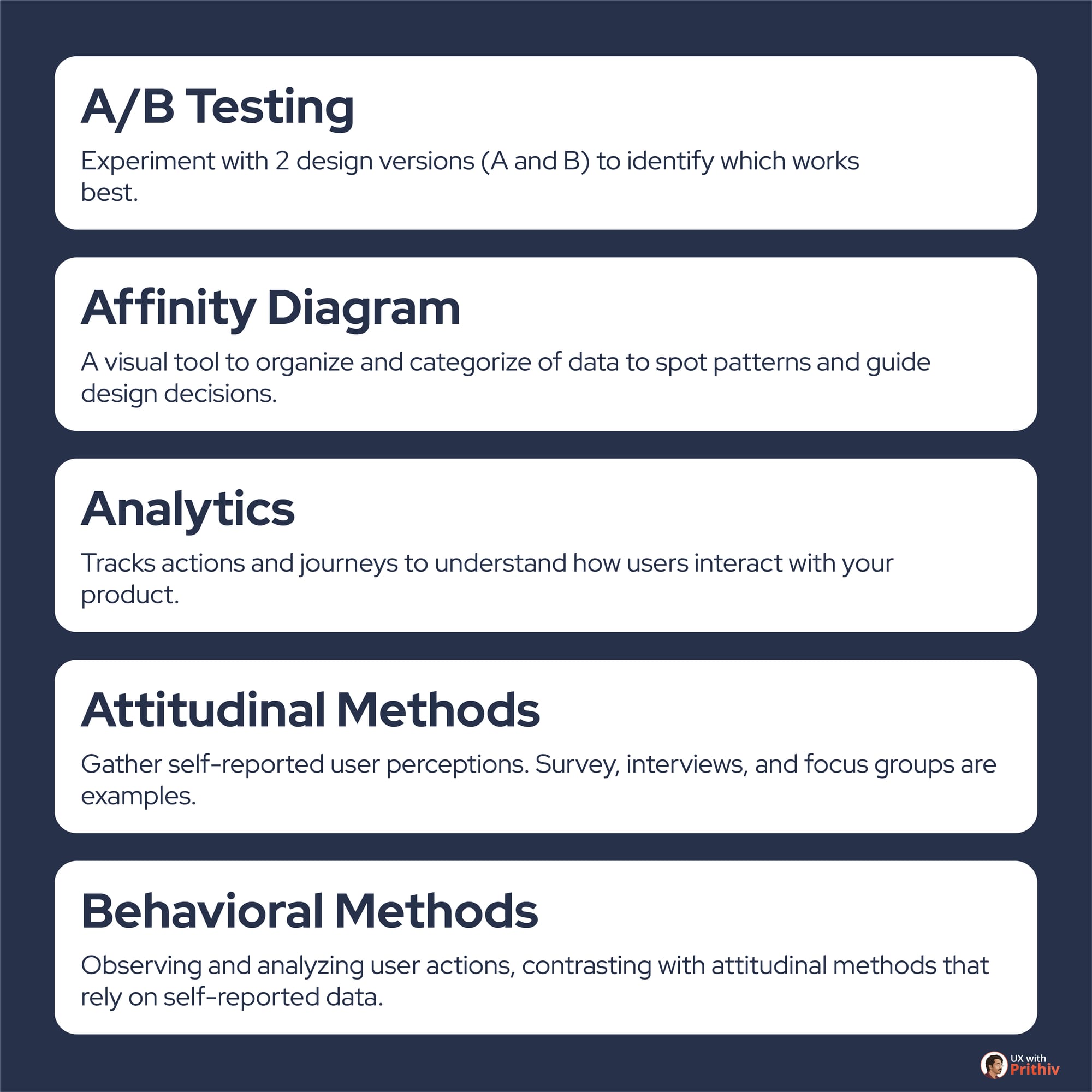 - Behavioral Methods: Observing and analyzing user actions, which contrasts with attitudinal methods that rely on self-reported data.