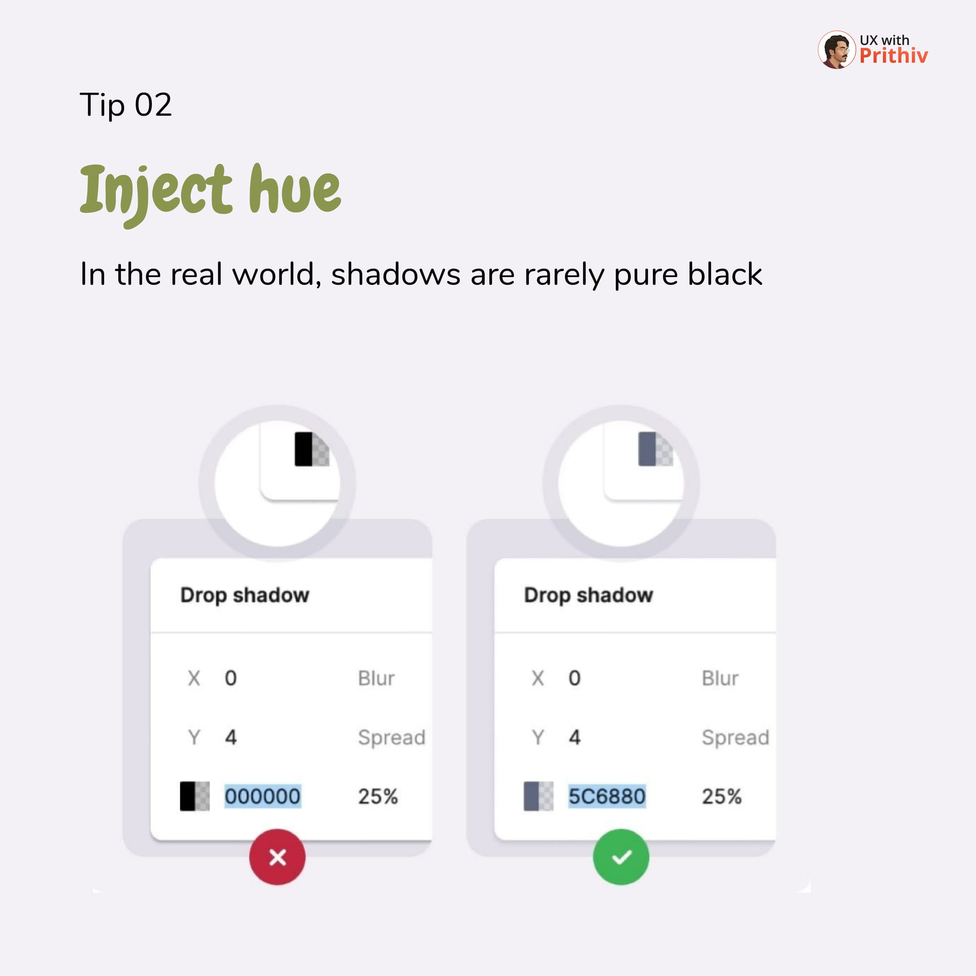 Both layers should use your custom hue (e.g., #5C6880). This two-part shadow system is what gives your UI elements a believable sense of weight and elevation.