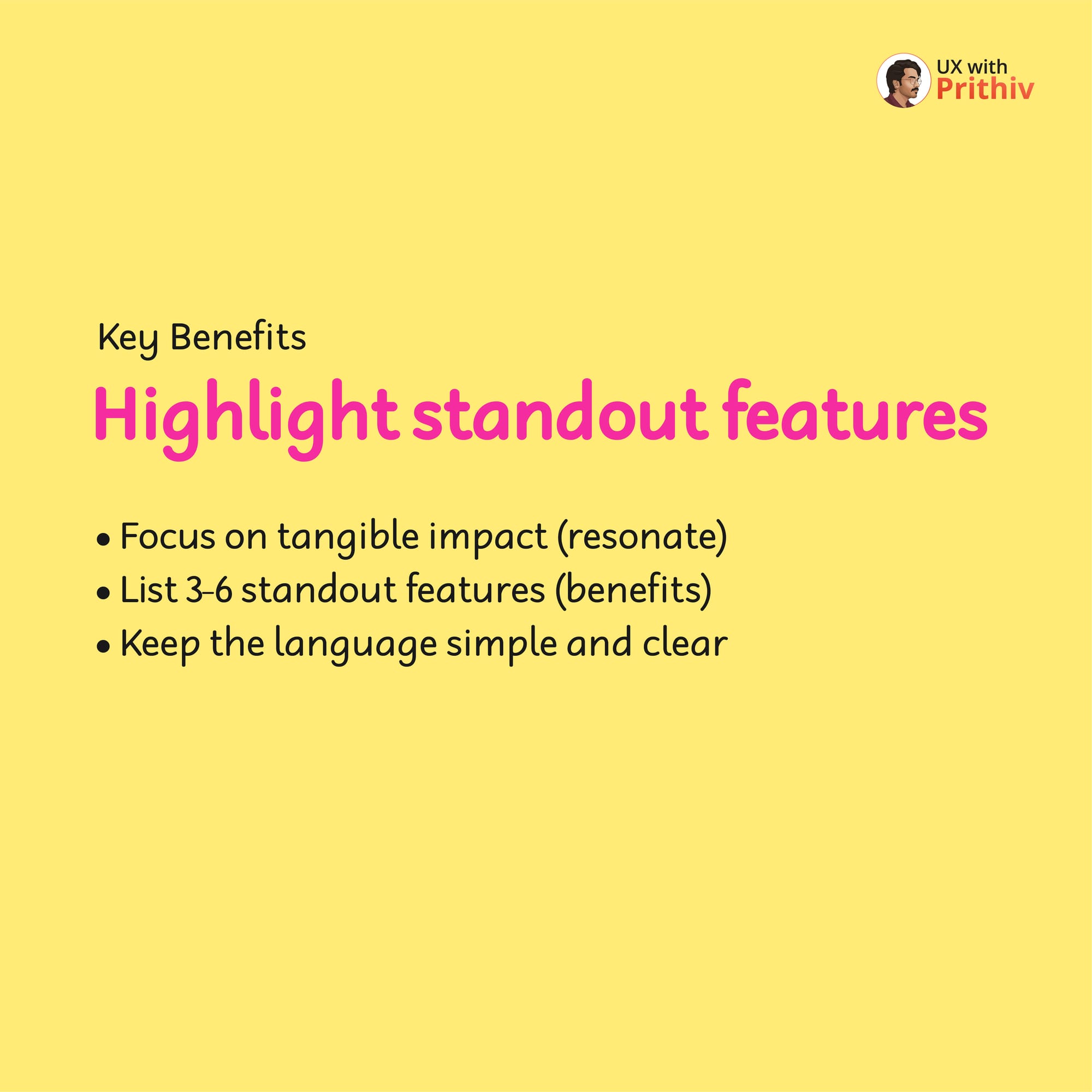 - List Clearly: List 3-6 standout features (benefits) and keep the language simple and clear.