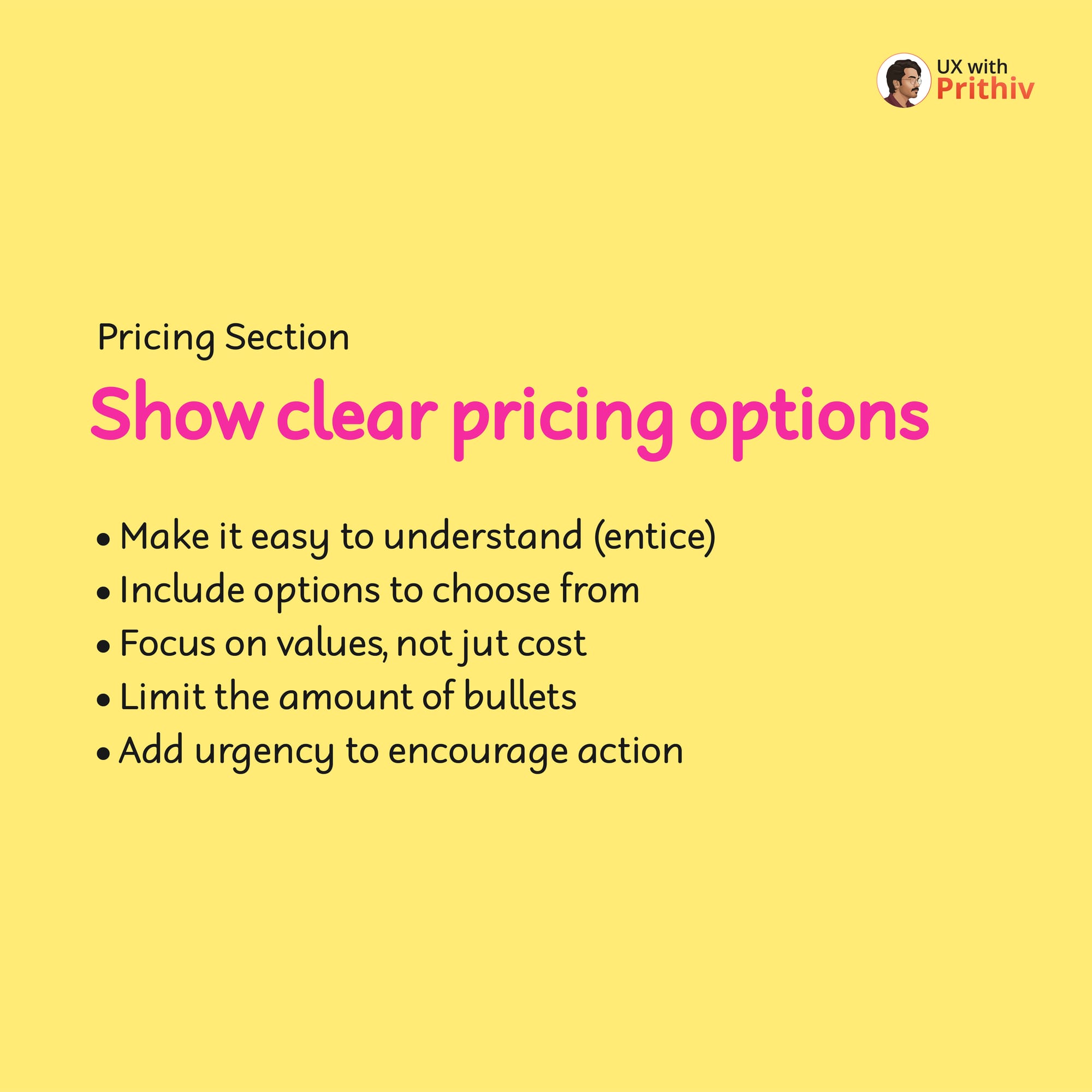 - Clarity: Show clear pricing options and focus on values, not just cost. Include options to choose from and add urgency to encourage action.