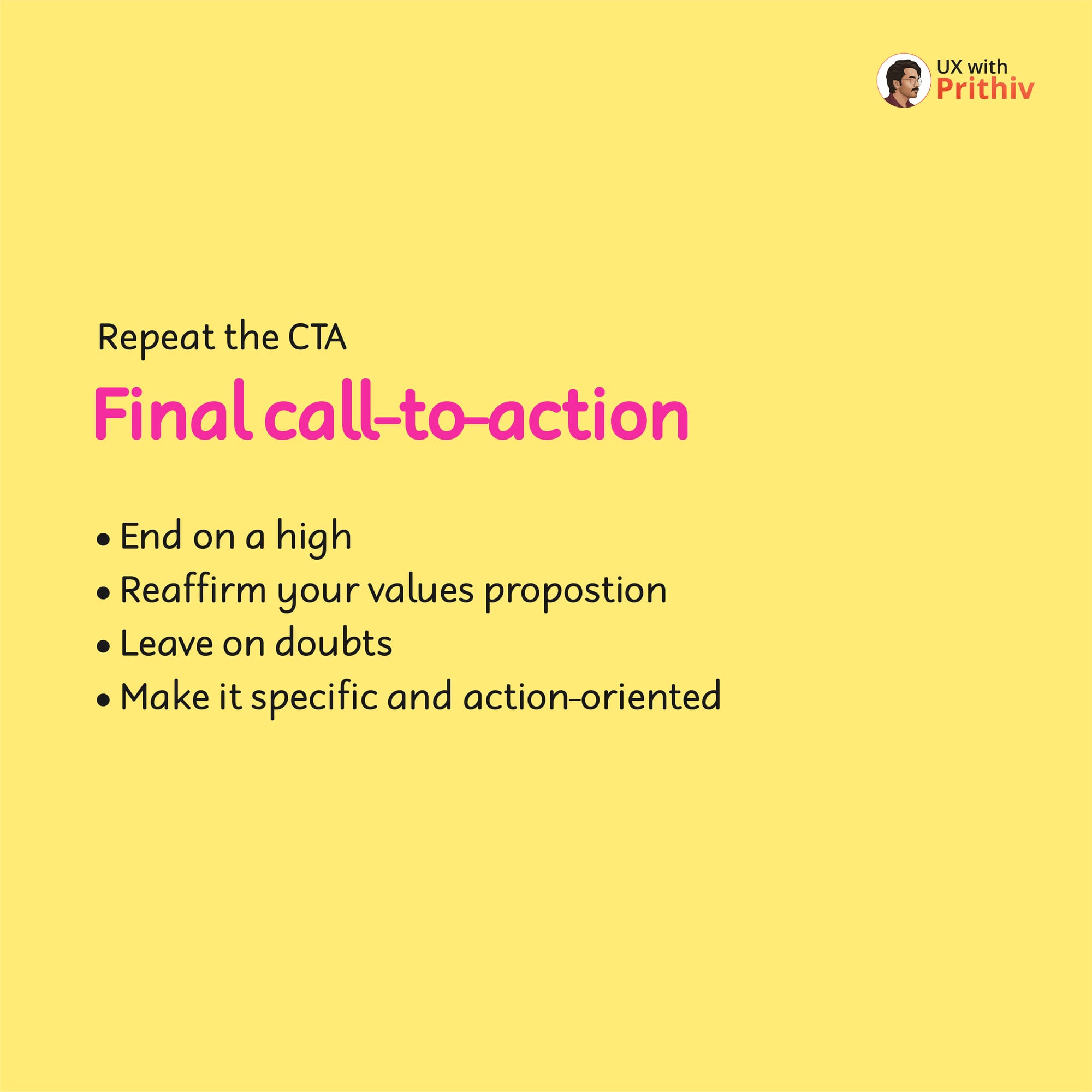 - Final Push: Reaffirm your value proposition, leave no doubts, and make the CTA specific and action-oriented.