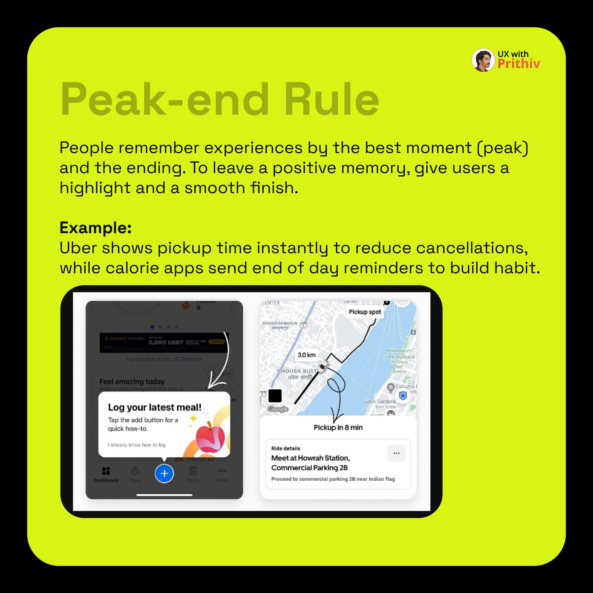 - In Practice: Ride-sharing apps like Uber show the exact pickup time instantly to reduce user anxiety (a high-value peak moment), while calorie tracking apps send end-of-day reminders to build positive habit loops (a smooth, memorable end).