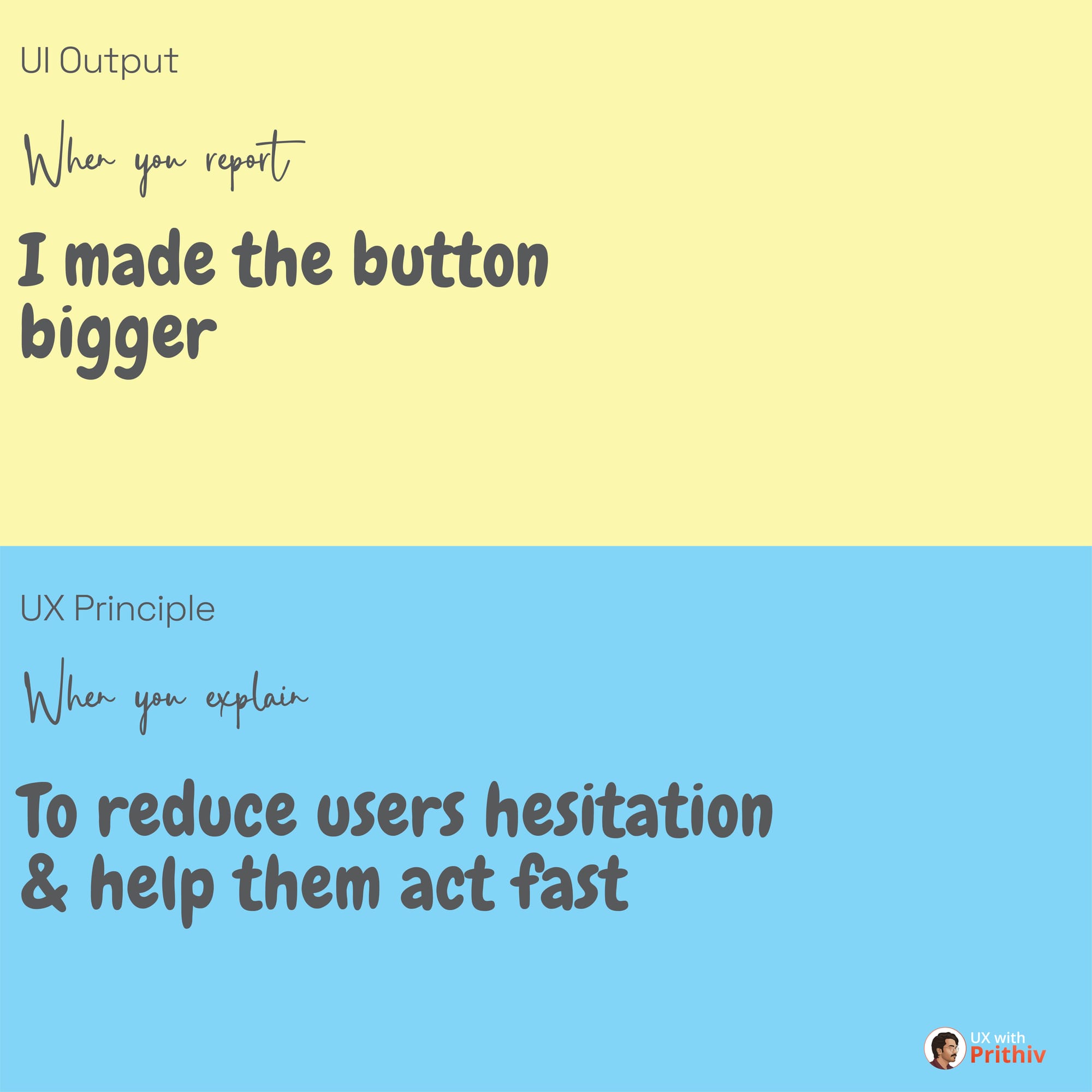 - EXPLAINING: To reduce users hesitation and help them act fast, I increased the primary CTA size by 16px, which led to a $3\%$ increase in click-through rate. (Focuses on the cognitive goal and business metric)