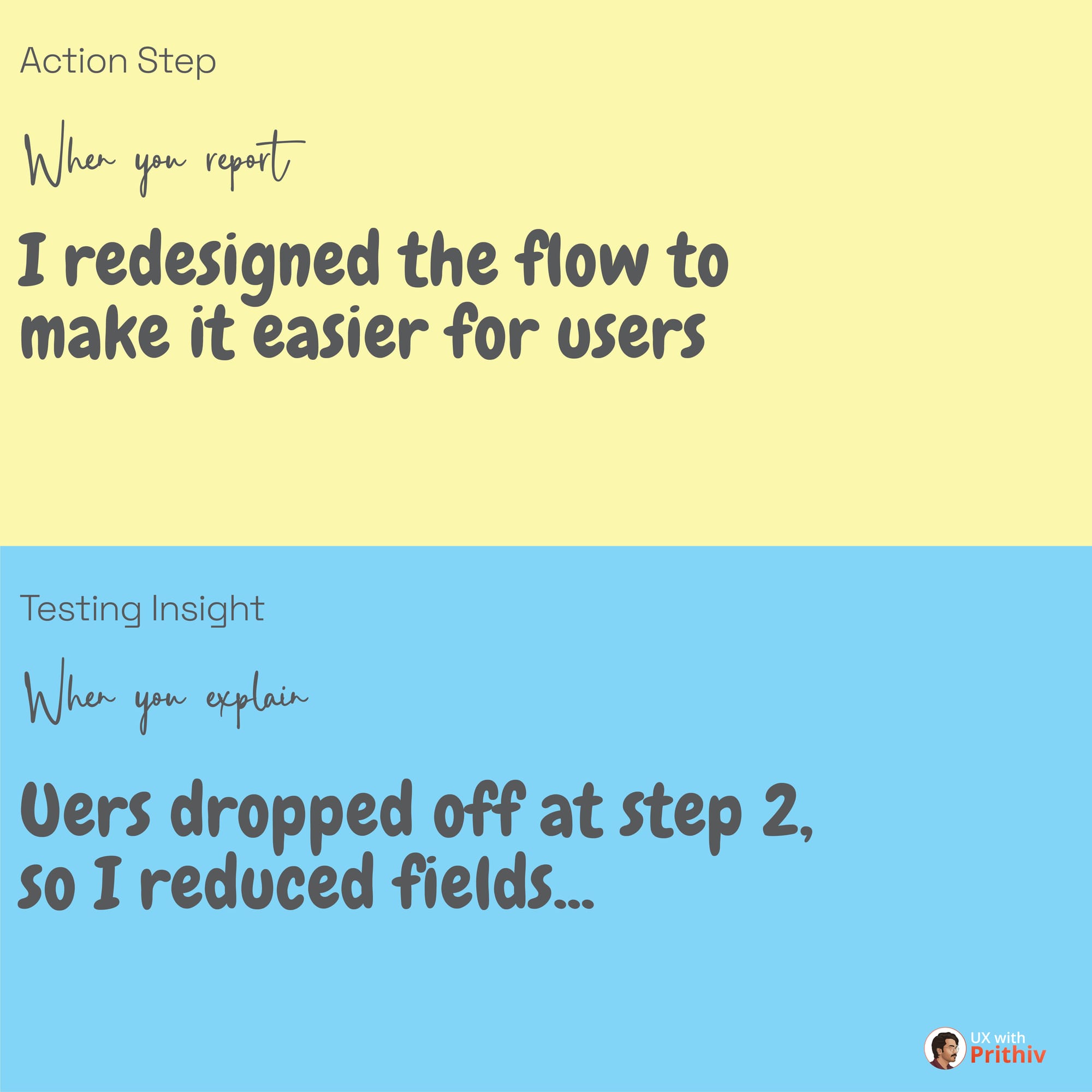 - EXPLAINING: Users dropped off at step 2 of the sign-up flow due to cognitive overload. I reduced the number of fields from 7 to 4, decreasing drop-off by $11\%$. (Focuses on the problem, insight, and solution)