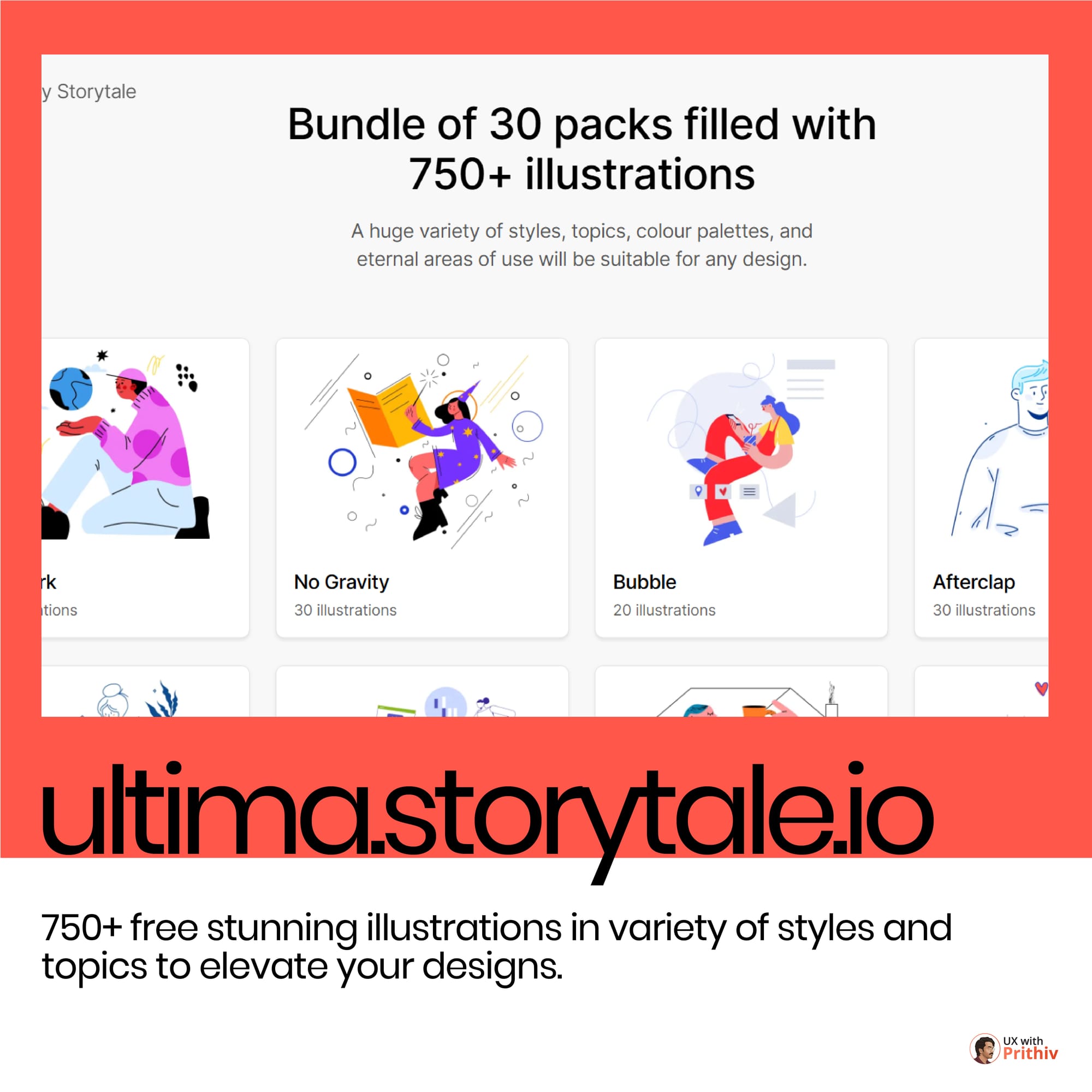 Finding consistent, high-quality illustrations is often time-consuming and expensive. ultima.storytale.io provides 750+ free, stunning illustrations across a variety of styles and topics to elevate your designs.