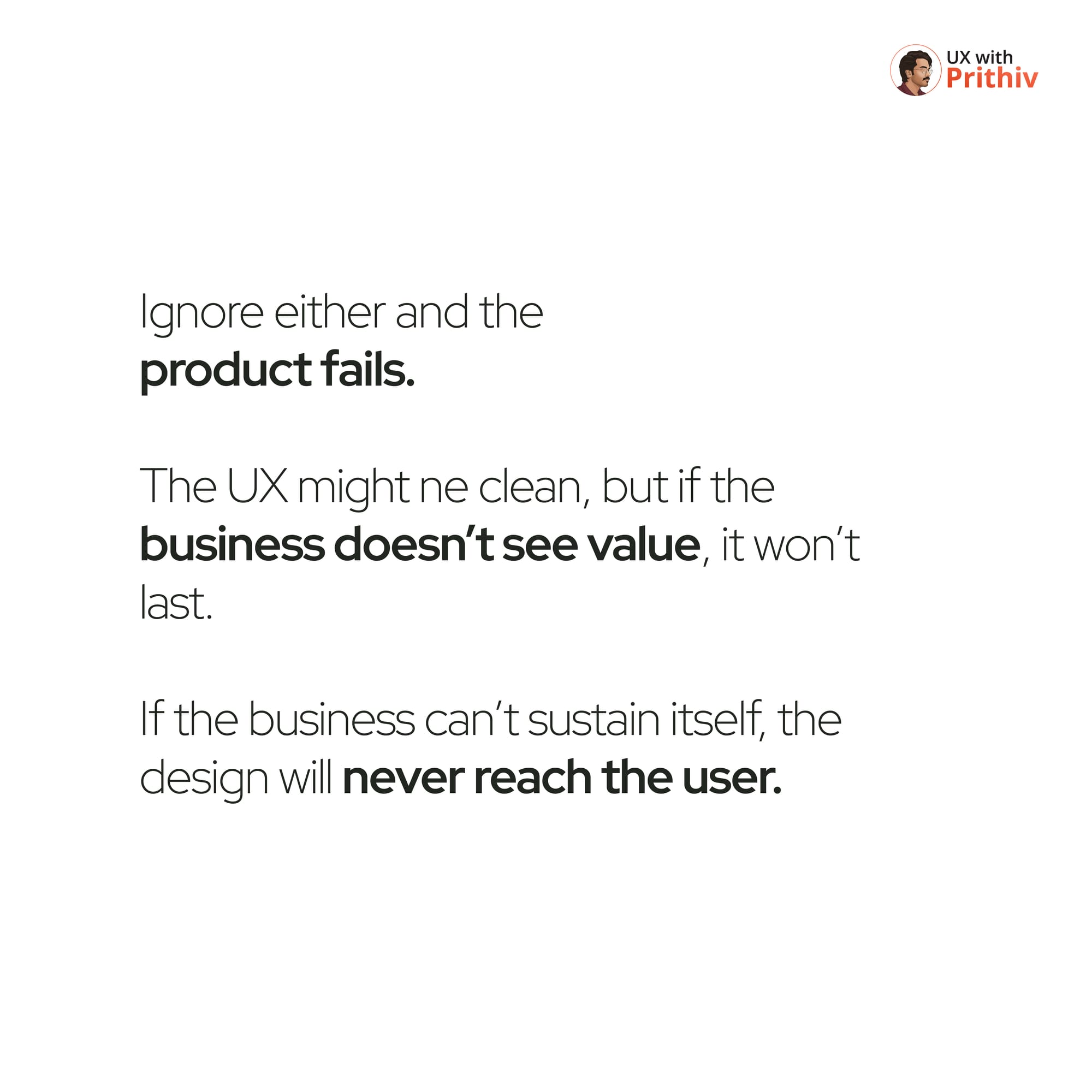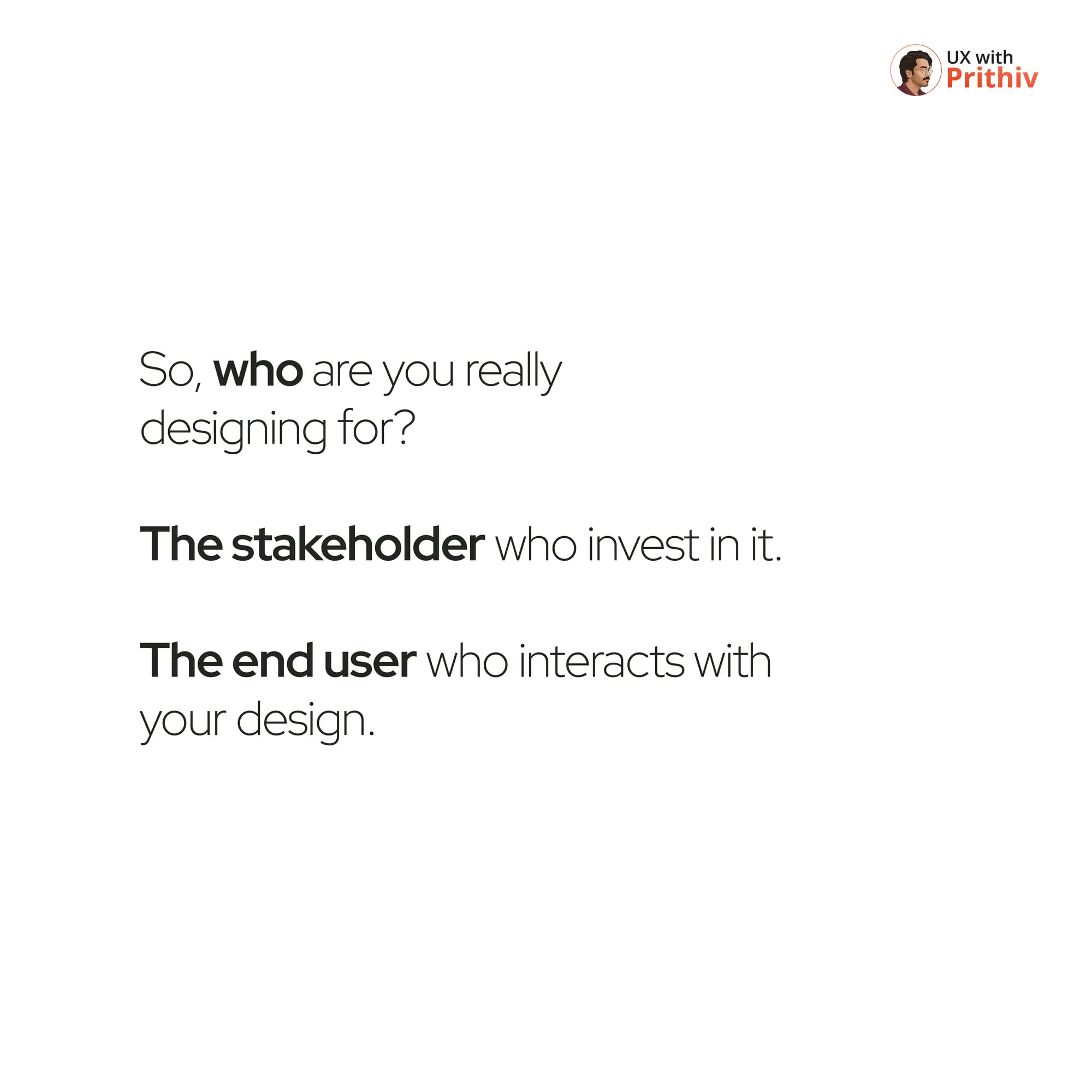 If you ignore the stakeholder, the beautiful design you create won't matter. The business won't see value, and the product won't last. If the business can't sustain itself, the design will never even reach the user. This ensures the product is sustainable and can grow.